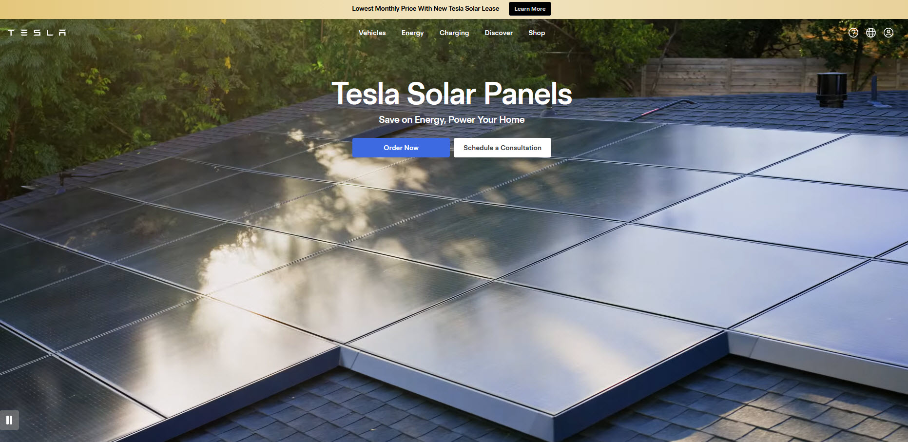 Tesla Solar uses minimalism and brand recognition to its advantage. The website emphasizes simplicity, clean visuals, and direct language, making complex solar and battery concepts feel accessible. Pricing pathways are clear, and the user journey is intentionally short, appealing to homeowners who value efficiency and clarity.